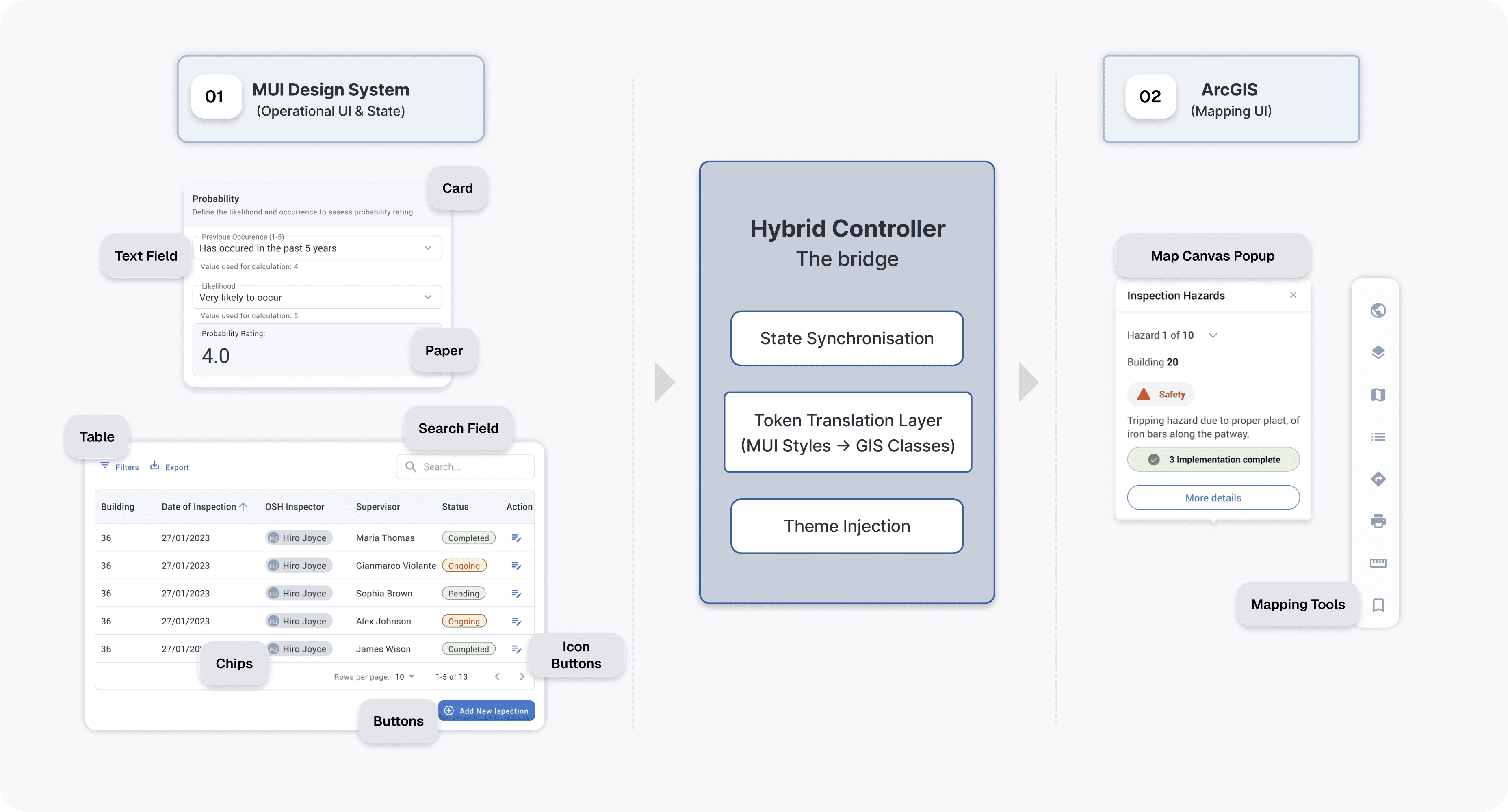 Our department designs map centric applications. Development were stuck due to the undocumented Esri Calcite "black box" design system, which contained GIS components beneficial to our products. This created a critical deadlock between engineers demanding MUI’s efficiency and stakeholders (mapping & product design teams) protecting mission-critical GIS utility.